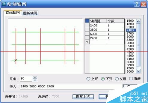 實例:上開間鍵入:4*6000,7500,4500 下開間鍵入:2400,3600,4*6000,3600,2400。左進深鍵入: 4200,3300,4200 右進深與左進深同,不必輸入。正交直線軸網,夾角為90度: 斜交直線軸網,夾角為75度:
