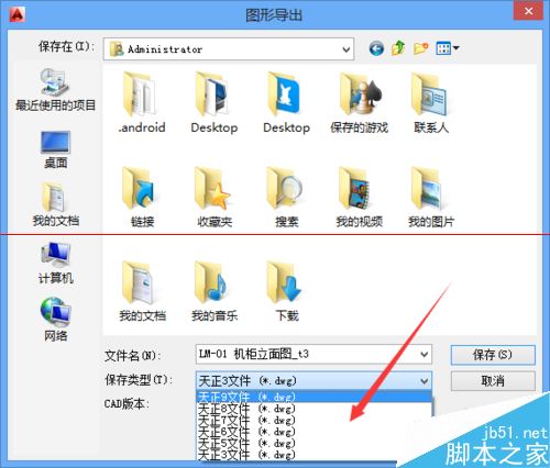 5、可以在保存類型中選擇天正3-9的文件,一般說的導T3格式,就是天正3的格式,用Autocad軟件可以直接打開并識別圖紙中所有內容。天正8文件為天正8.5編輯的文件,也是天正格式,CAD不能直接識別,但是天正8.5的軟件可以直接識別,默認T20的格式,8.5版本的天正軟件不能識別,天正9為天正2014軟件,其它版本的不常用就不再介紹了。
