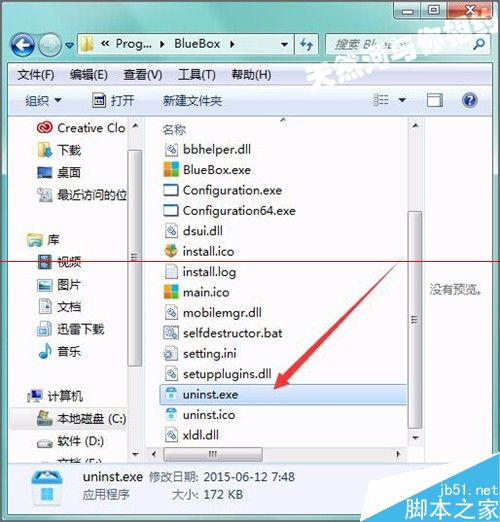 3、當我們雙擊打開BlueBox的文件夾后,在它的列表中,我們就可以看到它的安裝文件。這里我們要找到它的卸載程序。它的卸載程序就是uninst.exe的應用程序。