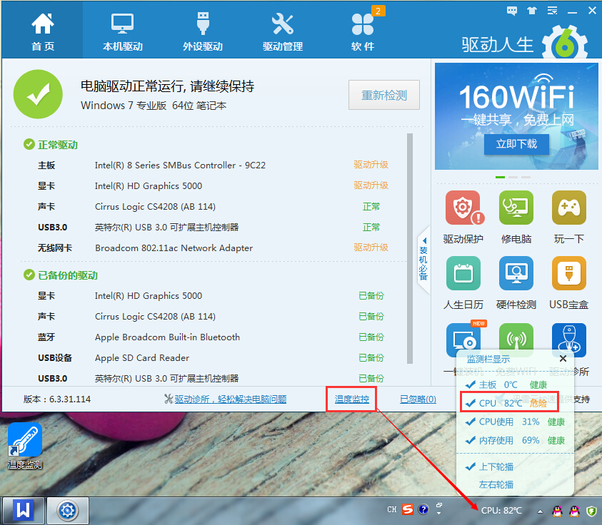 炎炎夏日,溫度太高,我們人會覺得渾身無力;電腦也是一樣,溫度太高會出現卡機、死機、自動關機等癥狀。所以我們應該隨時查看電腦的溫度情況,如出現警示溫度,就應該引起重視并采取相應措施給愛機降溫。將驅動人生的溫度監控功能打開,讓它在任務欄上下輪播或左右輪播電腦CPU、主板等的溫度情況,一旦發現異常溫度,可馬上做出對應措施。