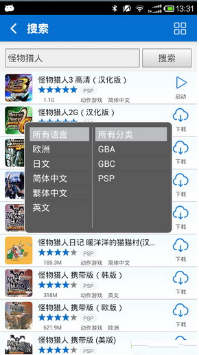 7、在主界面的搜索框,或者點擊上方的“搜索”圖標,然后輸入游戲名字即可進行搜索。指定內容會在全平臺中進行搜索,當然如果你想特定某一平臺,亦可觸摸搜索結果界面右上角的分類圖標,選擇平臺