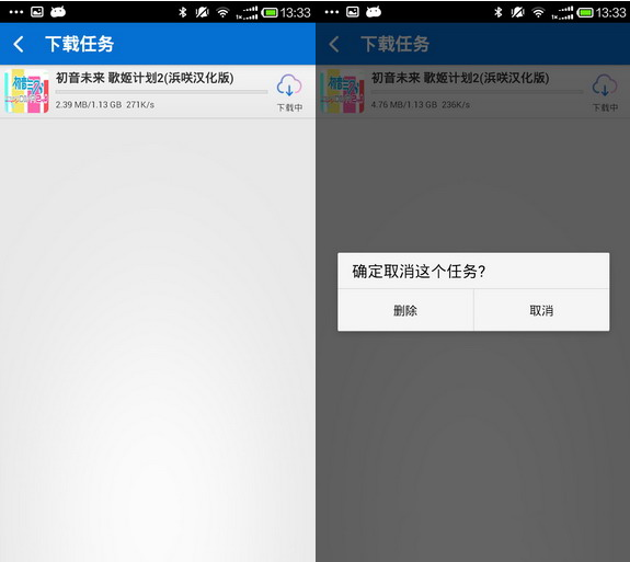 9、游戲下載中途,可以觸摸界面右上角的圖標進入下載任務管理頁面。在此處,觸摸名字右側可進行繼續“下載/暫停”下載的切換,觸摸游戲名字并確認之后就可以取消游戲的下載