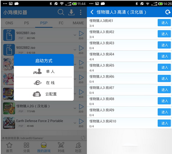 ②點擊【我的游戲】→點擊怪物獵人的【啟動】→點【在線】→選擇房間點擊【進入】→游戲中進入和房間相同數字的集會所。