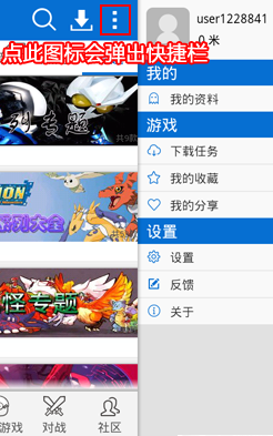5、右上角的三個圖標分別代表“搜索”、“下載列表”、“快捷選項欄”,觸摸就可以進入,如圖
