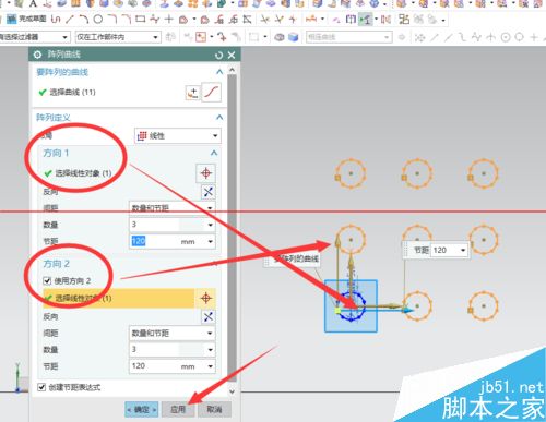 7、線性陣列:選中圖上的大圓與小圓,指定線性陣列的方向(此時(shí)只能選X/Y向,如果是往一個(gè)方向陣列,只使用方向1即可)