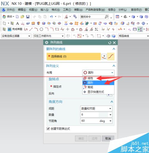 4、點(diǎn)擊UG草圖陣列功能,其分為環(huán)形陣列(繞圓周陣列)、線性陣列(繞直線陣列)