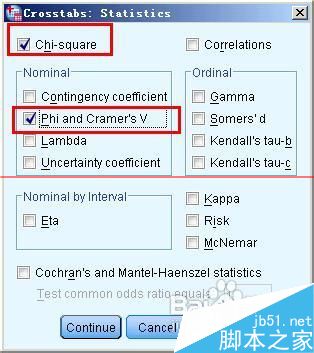 4、勾選chi-square(卡方檢驗),勾選phi and cramer's V(衡量交互分析中兩個變量關系強度的指標),點擊continue,回到交叉表對話框