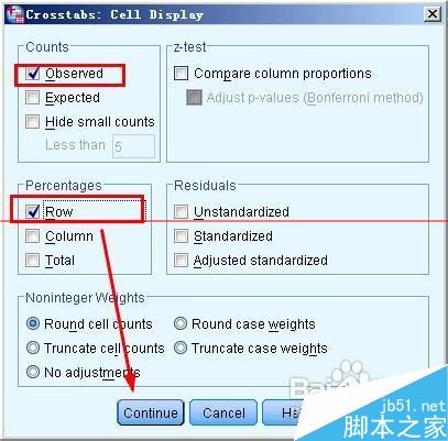 6、在這里勾選observed(各單元格的觀測次數),勾選row(行單元格的百分比),點擊continue,回到交叉表對話框