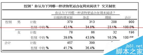 8、先看到的第一個表格就是交叉表,性別為行、選擇的讀物為列