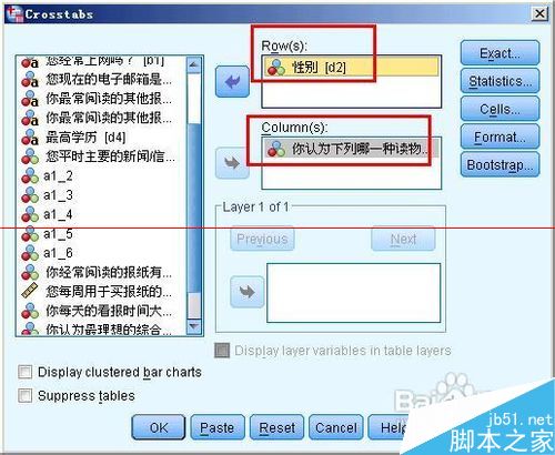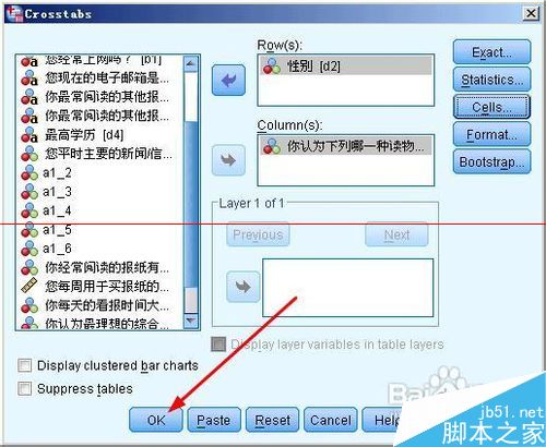 交叉表分析主要用來檢驗兩個變量之間是否存在關系,或者說是否獨立,其零假設為兩個變量之間沒有關系。我們在實際的工作中,經常用交叉表來分析比例是否相等。比如我們來分析一下,不同的性別對不同的報紙的選擇有什么不同,就是要用交叉表分析了,下面是具體的方法。