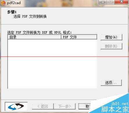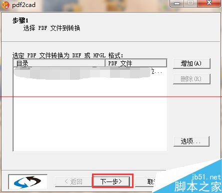 3、從本地電腦存儲路徑上選擇要轉換為cad的pdf格式文件,選定后點擊【添加】按鈕,該文件出現(xiàn)在該窗口列表內(nèi),如下圖所示。