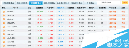 3、查看百強排行:支持盈利率、段位、被追蹤次數排行,從中發現值得關注的炒股高手。