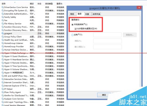 3、還有一點特別要注意的是,如果你要做為服務運行的程序是在運行后需要界面的,我們可以在控制面板里面找到管理工具然后打開服務或者直接運行“Services.msc”命令打開服務,找到剛剛創建的服務右鍵打開屬性,選中登陸選項卡,登陸身份選中本地系統帳戶并選中允許服務與桌面交互最后點確定,這樣你的服務在啟動后就可以看到界面了。