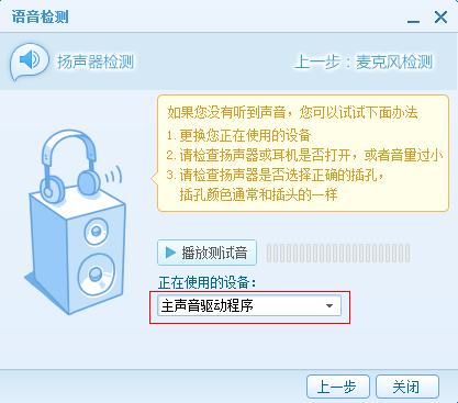 如果您能聽到QT播放的測試音,那么恭喜,您的揚聲器是正常的,點擊關閉按鈕開始正常語音吧。