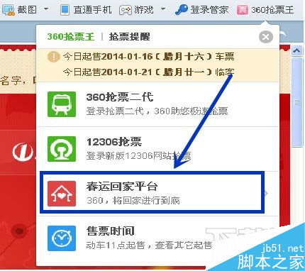 打開360瀏覽器,進入春運回家平臺,如下圖
