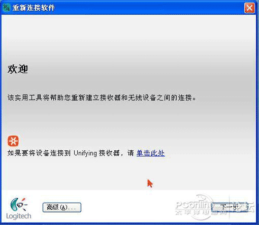 雙擊重新連接程序,點(diǎn)擊下一步,這時需將將無線鍵盤M705開關(guān)打開,軟件有提示: