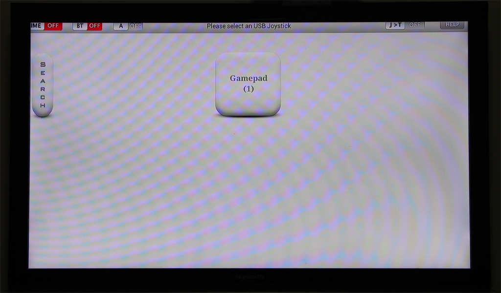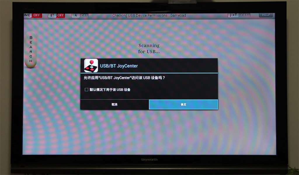 1、在樂視盒子上安裝好這個程序后,擊左側的“搜索設備”,在彈出的提示框上點確定(注意不要勾選“默認情況下用于該USB設備”的復選框),之后應用就會識別出連接至手機的游戲手柄,如圖: