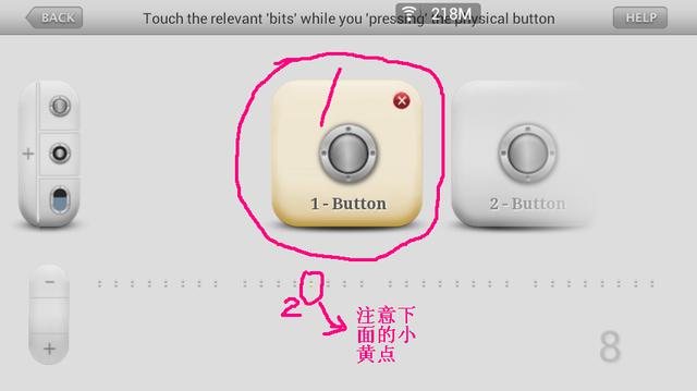 點擊一下圖中左上添加按鍵的按鈕就會添加一個按鈕,在屏幕中間會顯示出來,這樣你的手柄上有幾個按鍵你就添加幾個按鈕。添加完按鈕后,用鼠標點擊第1個按鈕,這時我們先按手柄上的1鍵,看下下面哪個點有反應,看到有反應的點之后,我們按住手柄上的1鍵,再鼠標點那個有反應的點(注意上下的小點分開來,不要點兩個或兩個以上),點了之后會有點微黃的感覺,這時松開手柄上的1鍵,這時我們剛剛點的那個小點就會變成黃色的小點,如圖: