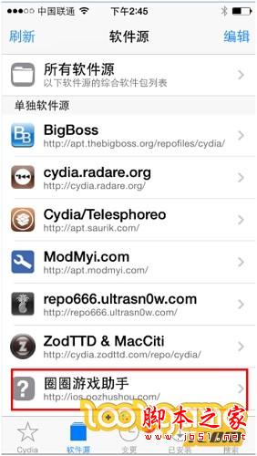 1、首先點擊已經越獄的IOS設備上的cydia圖標,進入管理界面后,選擇軟件源(下圖紅框所示位置);