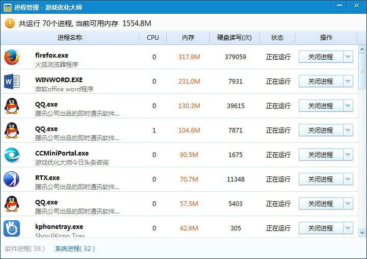 進(jìn)程管理——久經(jīng)游戲場的用戶們在玩游戲前都會把不用的進(jìn)程關(guān)掉,無奈windows自帶的進(jìn)程查看太難懂,各種英語各種符號,一不小心關(guān)錯一個,坑到自己,只能重啟電腦再來一遍,就跟博彩一樣,十分蛋疼。這個進(jìn)程管理小工具可以秒速讀出用戶所開啟的程序以及所占內(nèi)存大小、硬盤讀寫次數(shù)。用戶可根據(jù)數(shù)據(jù)自行關(guān)閉或開啟程序,為流暢的游戲做好鋪墊。