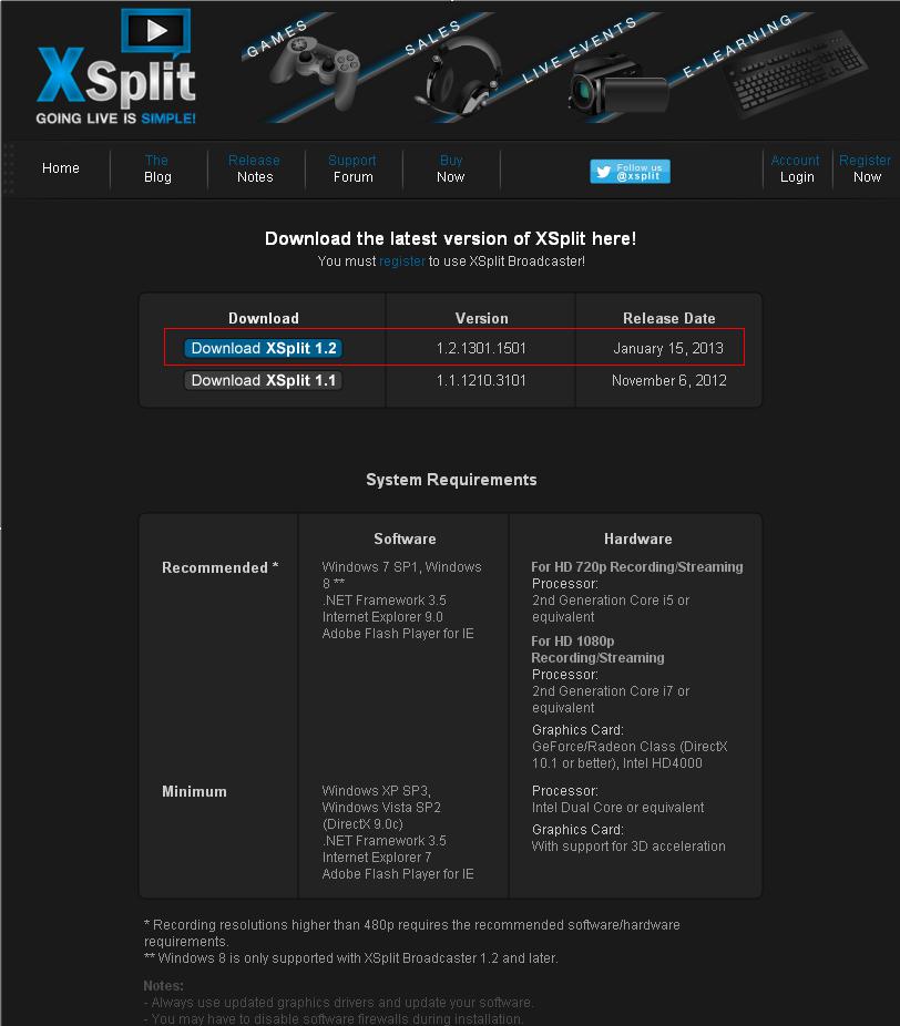 第一步:通過http://www.xsplit.com/get/頁面下載Xsplit軟件(紅色圈內(nèi)為最新版本下載連接)