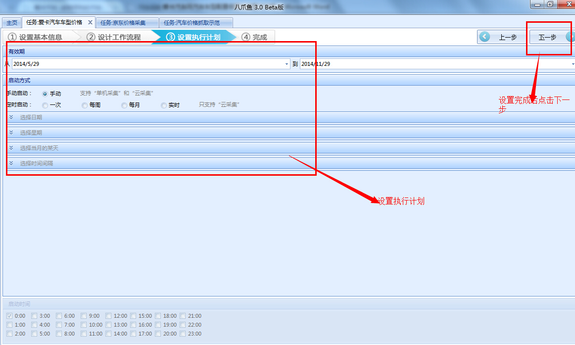 第八步,設(shè)置完成后,點(diǎn)擊下一步,進(jìn)入到執(zhí)行計(jì)劃流程,設(shè)置計(jì)劃執(zhí)行的方式,建議推薦云采集,速度快并可以判斷數(shù)據(jù)是否存在重復(fù)下載。