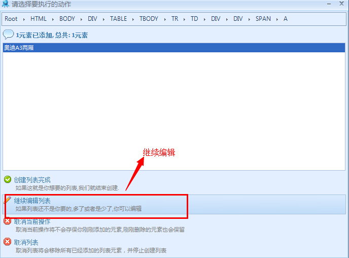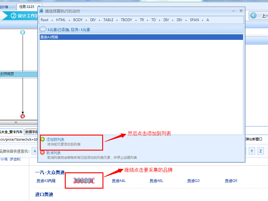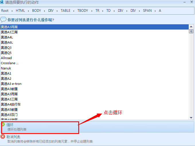 第三步,點(diǎn)擊要采集的頁面元素,比如說奧迪S7,系統(tǒng)彈出對(duì)話框后,選擇創(chuàng)建一個(gè)元素列表處理一個(gè)元素