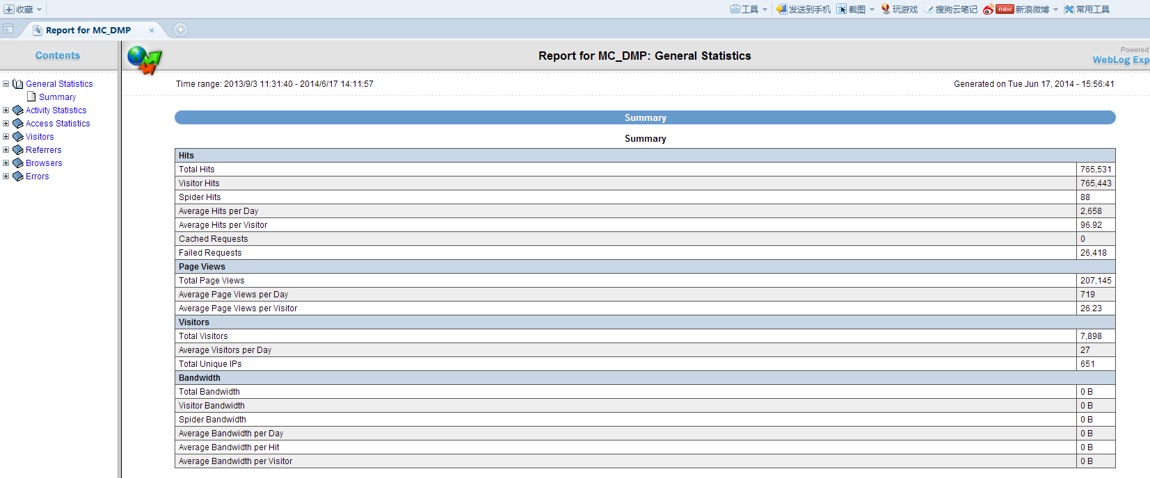Weblog expert是一個(gè)快速和強(qiáng)大的訪問(wèn)日志分析器。這會(huì)讓你了解你的網(wǎng)站的訪客:活動(dòng)統(tǒng)計(jì),訪問(wèn)的文件的路徑,通過(guò)該網(wǎng)站,信息指頁(yè)面,搜索引擎,瀏覽器,操作系統(tǒng),和更多。該計(jì)劃所產(chǎn)生的易于閱讀的報(bào)告,包括文本信息(表)和圖表。
