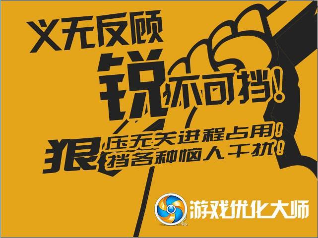 您是否遇到過即將一槍爆敵人頭時彈出的廣告讓您抓狂憤怒?您是否在即將拿下第一滴血時被某個系統文件更新的提示彈出游戲哭笑不得?您是否討厭豬一樣的朋友在您游戲時不斷的閃QQ發視頻邀請抖動屏幕求聊天?游戲優化大師的防打擾環境給您的感覺一定是像至尊寶打死了耳邊嗡嗡嗡嗡的該死蒼蠅一般,讓您大呼這個世界終于清靜了!您開啟的世界就是游戲的純凈世界,其他的各種惱人干擾,就讓我們像齊天大圣一樣揮舞起金箍棒,全部打出我們的游戲世界!