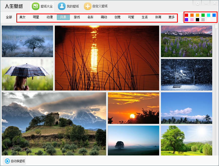 你還可以自定義設置桌面壁紙。點擊左下角自動換壁紙,就可以自定義選擇壁紙類別,并且選擇自動切換的時間,那么在你自己不操作的情況下,就可以隨時隨心切換壁紙。如果你喜歡用自己拍的照片設置成桌面壁紙,你也可以點擊自定義壁紙,添加電腦本地的照片來設置壁紙。人生壁紙會給你私人定制般的待遇。