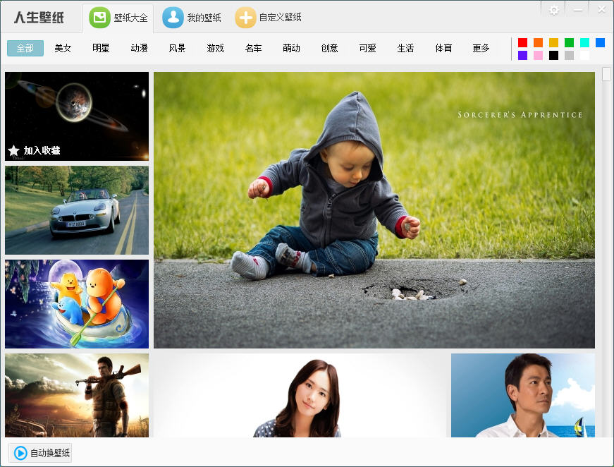 人生壁紙有十四類壁紙圖片,有男童鞋會喜歡的動漫、游戲、名車等分類,也有女童鞋會中意的明星、萌動、可愛等分類。如果你是顏色控,你也可以點擊右上角的顏色類別,選擇自己最愛的顏色分類。