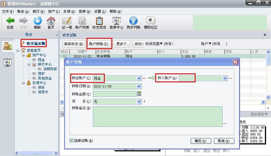 也可以,點擊“收支流水賬”,選擇“賬戶轉賬”,出現賬戶轉賬信息頁面。選擇轉賬賬戶,錄入金額等,點擊“確定”,即完成一筆轉賬記錄。