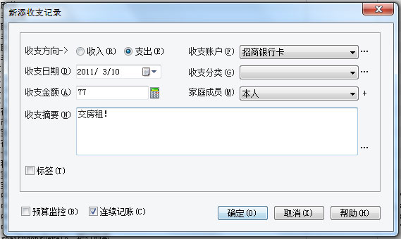 在記賬界面中,選擇剛才建立的招商銀行卡賬戶進行記賬
