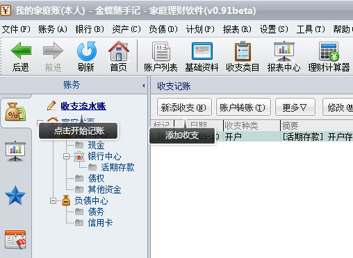 點擊標準按鈕欄上“記一筆”,出現記一筆頁面,點擊“轉賬”,選擇轉賬賬戶,錄入轉賬金額等,確定,即完成一筆轉賬記錄。