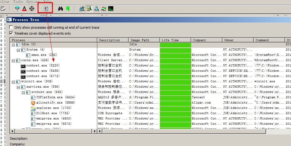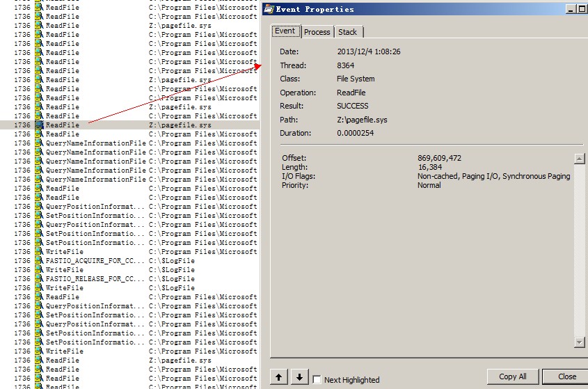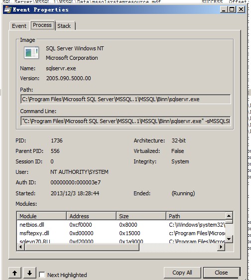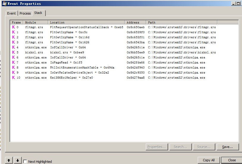 其實大家可以用左鍵雙擊每條記錄,會打開一個詳細屬性對話框,里面包含了很多關于進程信息,堆棧信息