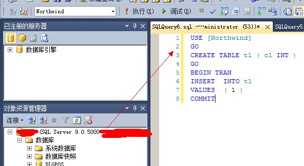 1 USE [Northwind]2 GO3 CREATE TABLE t1 ( c1 INT )4 GO5 BEGIN TRAN6 INSERT INTO t17 VALUES ( 1 )8 COMMIT