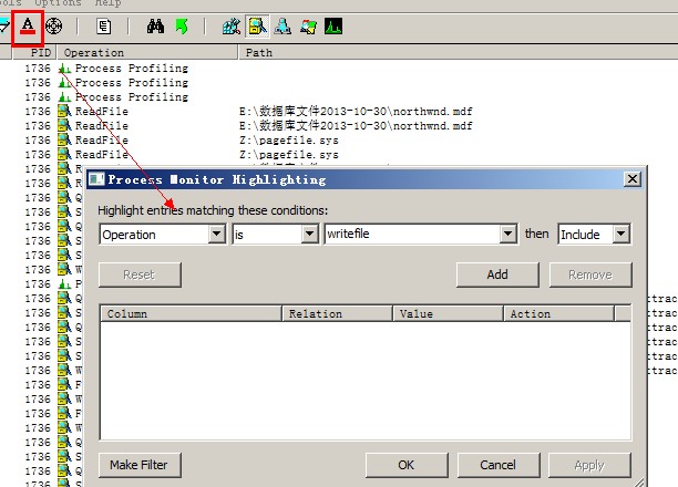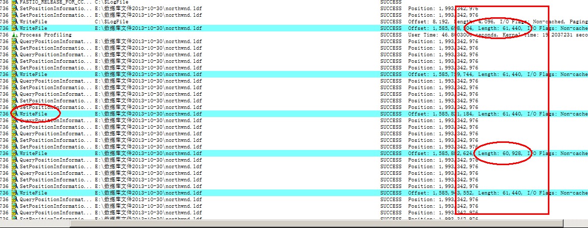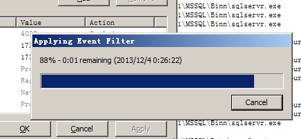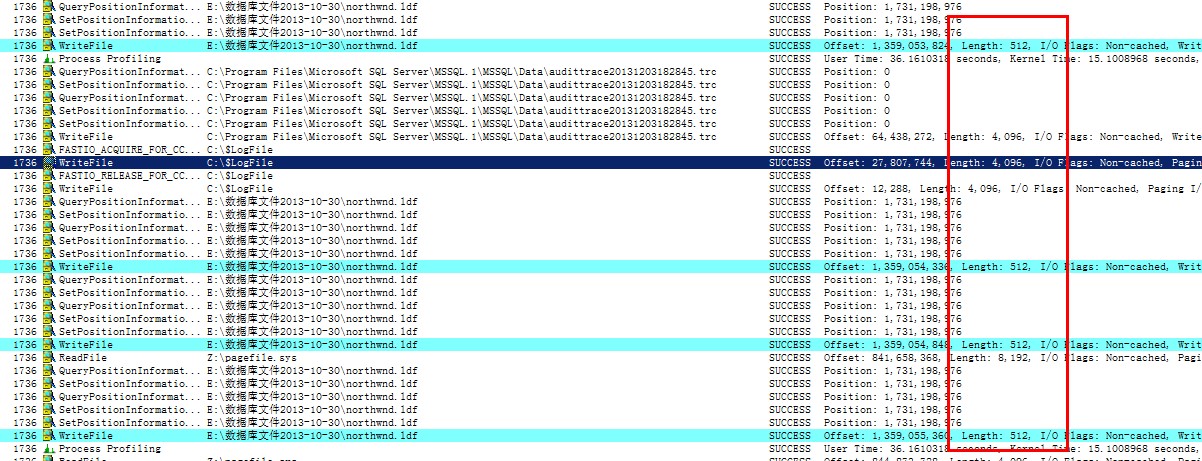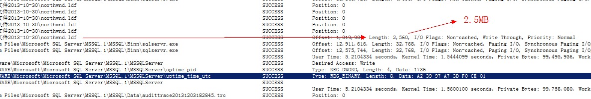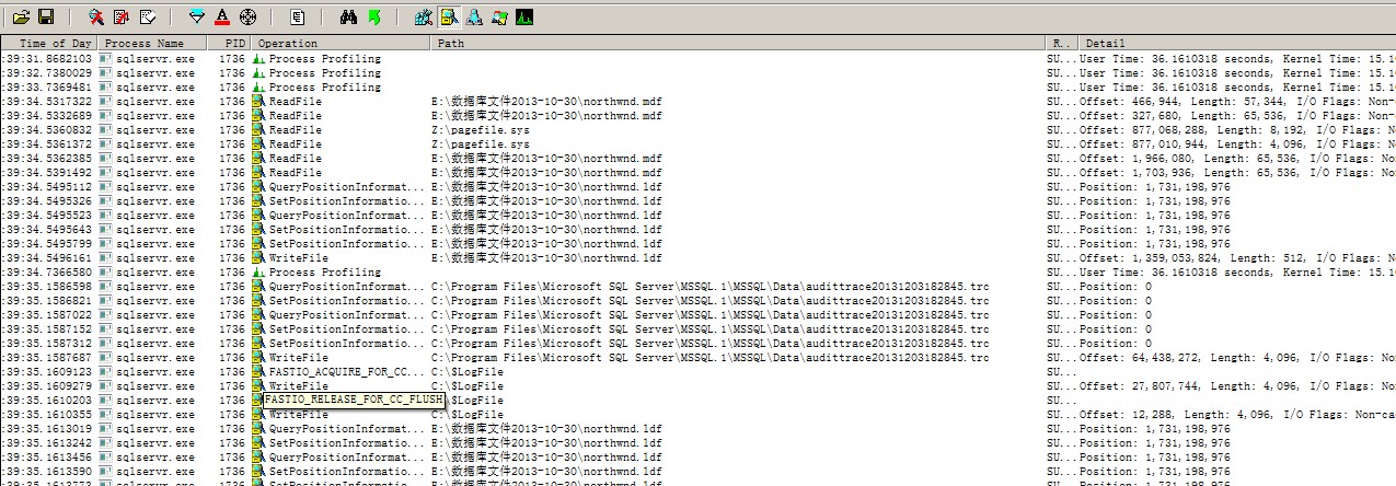 剛才點擊確定之后,Procmon.exe會馬上捕獲SQLSERVER所有與文件系統相關操作的事件