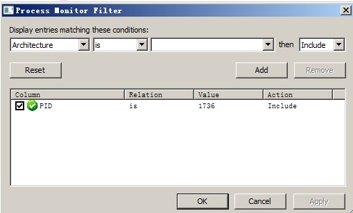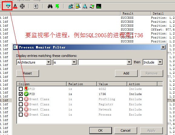 第七步:過濾:可以過濾的內容比較多,我這里就選擇只顯示SQL2005進程的內容