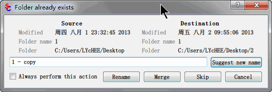 只能在復制過程中彈出操作提示框,雖然非常清晰地顯示出 源文件夾 與 目標文件夾中沖突文件的創建時間,文件名以及具體位置,但是提供的選項過于單一,與系統自帶的復制軟件相比較,沒有特別大的優勢,更不需說和以上三款軟件相比了呢。