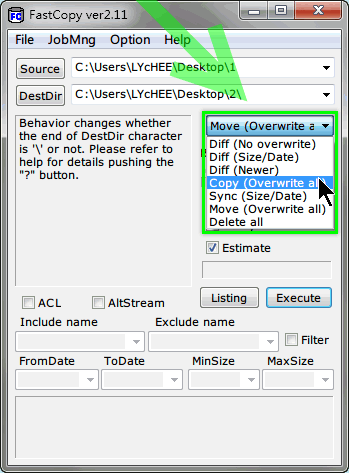 Diff (Size/date) :當目夾不存在或大小/日期不同時復制(默認)
