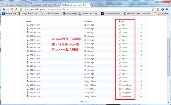 17. 這就是申請完的畫面,這時可以去referrals status看剛剛填的分身賬號status,出現completed就恭禧啦,反復以下操作,很快就有16G空間嘍!