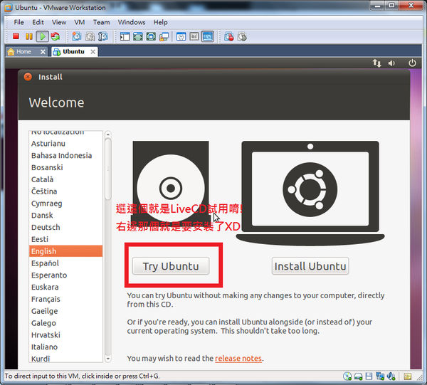 6. 啟動VMware虛擬機后,因為我們用LiveCD方式進入即可,不用安裝,所以選左邊的Try Ubuntu