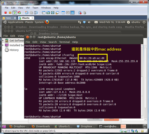 2. 由于Dropbox在Linux Distribution下,辨認是否為同一個人(PC),是用Mac address來辨認,所以就是在這邊動手腳。