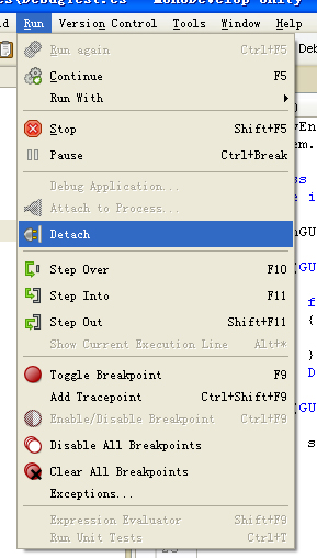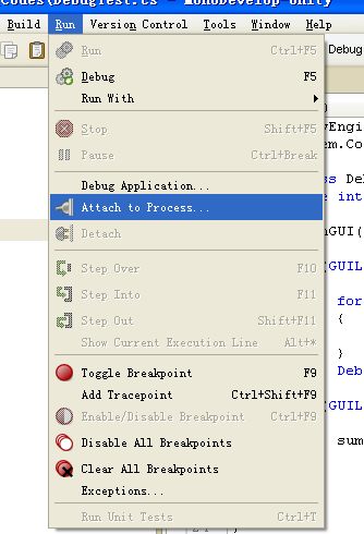 第二種方法,無需關掉Unity,在MonoDevelop的Run菜單下選擇Attach to Process