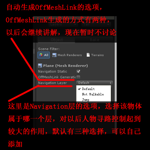 OffMeshLink Generation選項是選擇該物體是否根據高度、可跳躍寬帶等全局的選項自動生成OffMeshLink,這個會在以后的講解中詳細說明,這次就暫時不討論。