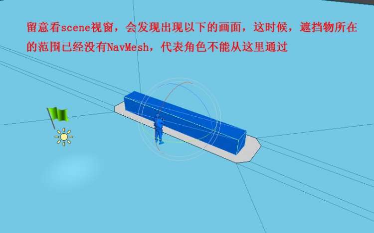 觀察scene視窗,會發現剛才整個地面都是NavMesh的情況已經改變了,在障礙物的周圍,NavMesh留出了一個缺口,這代表了角色已經不能從障礙物身上通過了。