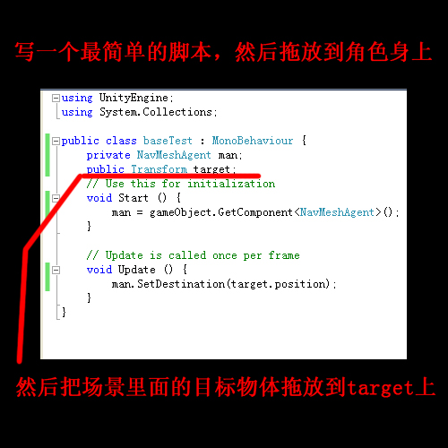 簡單的解釋一下,這個腳本是直接拖放到角色(man)身上的,并把場景中的目標物體(target)拖放指定到該腳本的target變量上面進行了賦值。在腳本一開始的時候,我 先獲取了man身上的NavMeshAgent腳本組件,然后在Update的過程中,man不斷的進行對target的位移的一個尋路并移動到目標位置的操作。