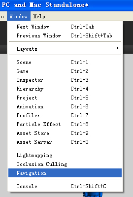 先來看看怎么在unity打開NavMesh功能的窗口吧: