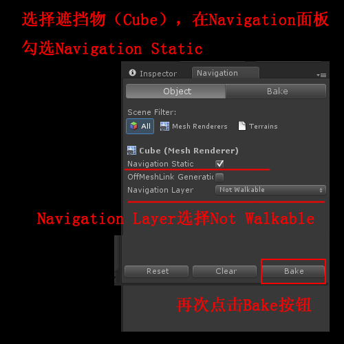 和剛才對地面的操作差不多,選擇遮擋物Cube,在Navigation面板里面勾選Navigation Static選項,這次的Navigation Layer要選擇Not Walkable。顧名思義,這是不能行走的意思,代表了這個Cube是不能通過的。
