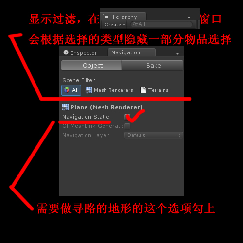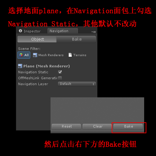 還記得剛開始介紹的Navigation面板嗎?選擇地面(plane),在Navigation面板里面里面勾選Navigation Static選項,其他的默認不改動。
